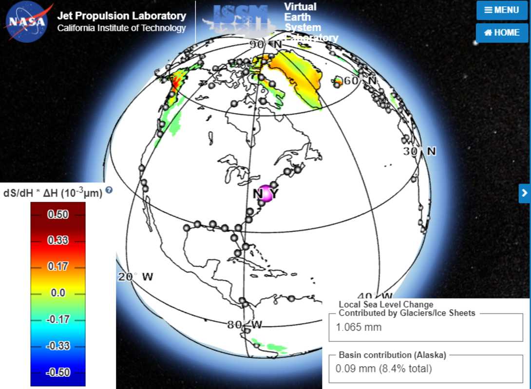 Як приклад вчені наводять три райони — Сідней, Лондон та Нью-Йорк. Для двох останніх потенційною небезпекою можуть стати талі льодовикові води Гренландії. Рівень води біля Лондона може піднятися через танення північно-західного району острова, біля Нью-Йорка — через танення Гренландії в північних і східних районах.Рівень води неподалік Сіднея може змінитися внаслідок танення льоду на півночі, північному заході та північному сході Антарктиди.Програму створили вчені із команди Лабораторії реактивного руху NASA. Вони вважають, що їхнє творіння буде доволі популярним та корисним і для інших країн.