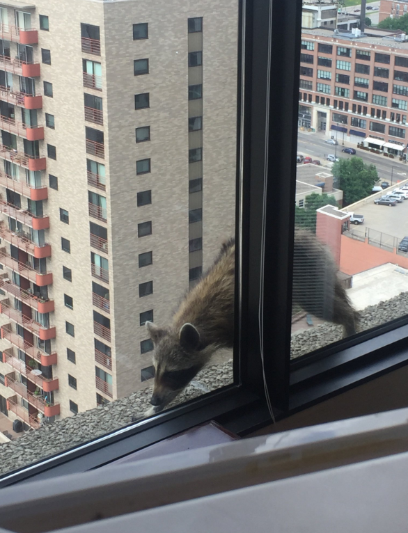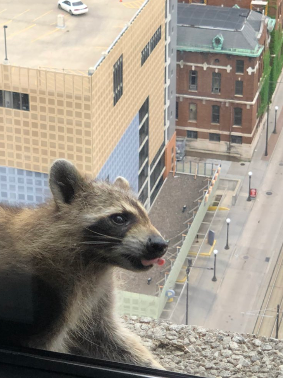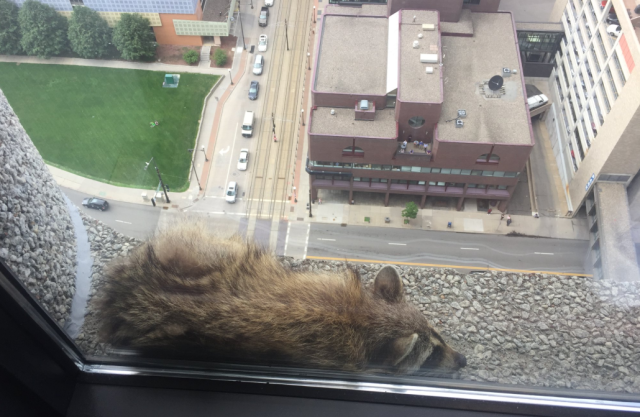 В американському місті Сент-Пауло в штаті Міннесота єнот по стіні хмарочоса видерся на 23-й поверх.На останньому поверсі він вмостився на підвіконні і заснув. Єнота-альпініста сфотографували працівники офісної будівлі UBS Plaza. За долею звіра в прямому ефірі місцевого телеканалу стежила вся країна, про це повідомляє Ракурс з посиланням на The Guardian.