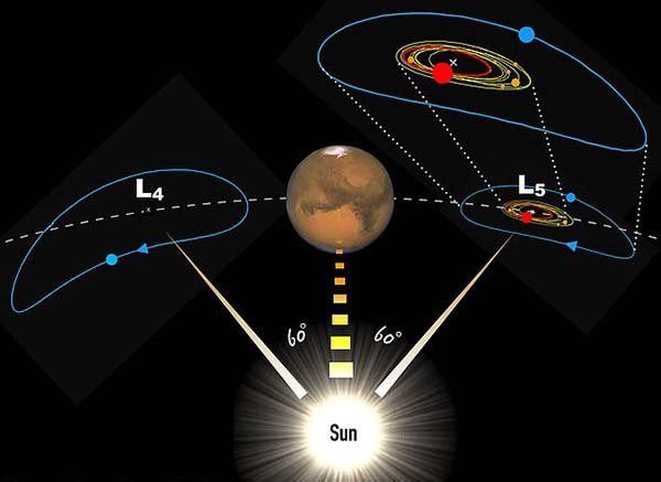 Зображення планети Марс і свити троянців, які кружляють навколо точок Лагранжа L4 і L5 Armagh Observatory