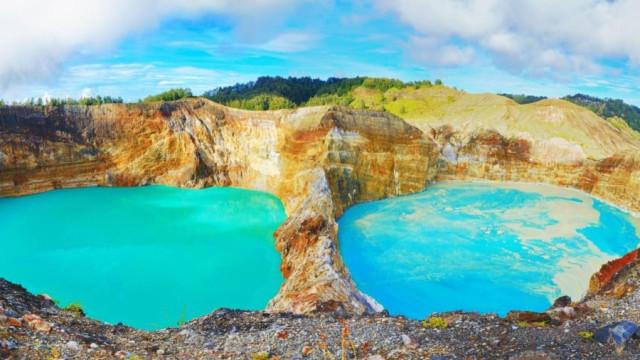 Вулкан, у якому приховано три загадкових озера, знаходиться в Індонезії. Дивним є те, що вода в цих озерах різного кольору. Водойми розташовані не далеко один від одного.