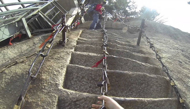 Точної кількості щаблів, вирізаних прямо на поверхні гори Хуашань, однієї з п’яти священних гір даосизму в Китаї, ніхто не знає. Ймовірно, тому, що кожен, хто коли-небудь намагався вести рахунок, збивався з ліку через запаморочливі краєвиди і страх смерті. Після того як вертикальне сходження закінчиться, вас чекає не менш пекельна горизонтальна прогулянка – доріжка шириною всього у три дошки, прибитих прямо до вертикального схилу гори, і лише один ланцюг, за який можна триматися. Після цього – знову низка звивистих сходин. Коли ви нарешті дійдете до вершини Хуашань, ви дізнаєтеся, що «небеса» – це важкодоступний чайний будиночок з приголомшливим виглядом.