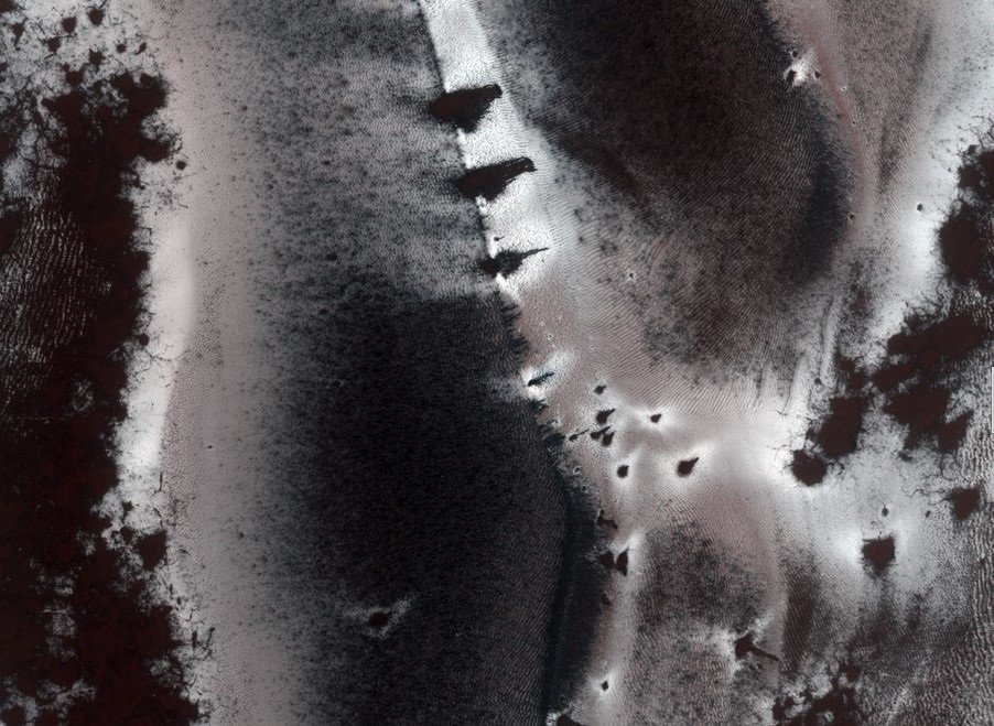NASA оприлюднило знімок зими на Марсі, коли поверхня планети покрилася снігом з вуглекислого газу. Діоксид вуглецю з атмосфери перетворюється в сухий лід, якщо температура опускається до мінус 125 градусів за Цельсієм. Фотографії були опубліковані на сайті агентства, передає Корреспондент.