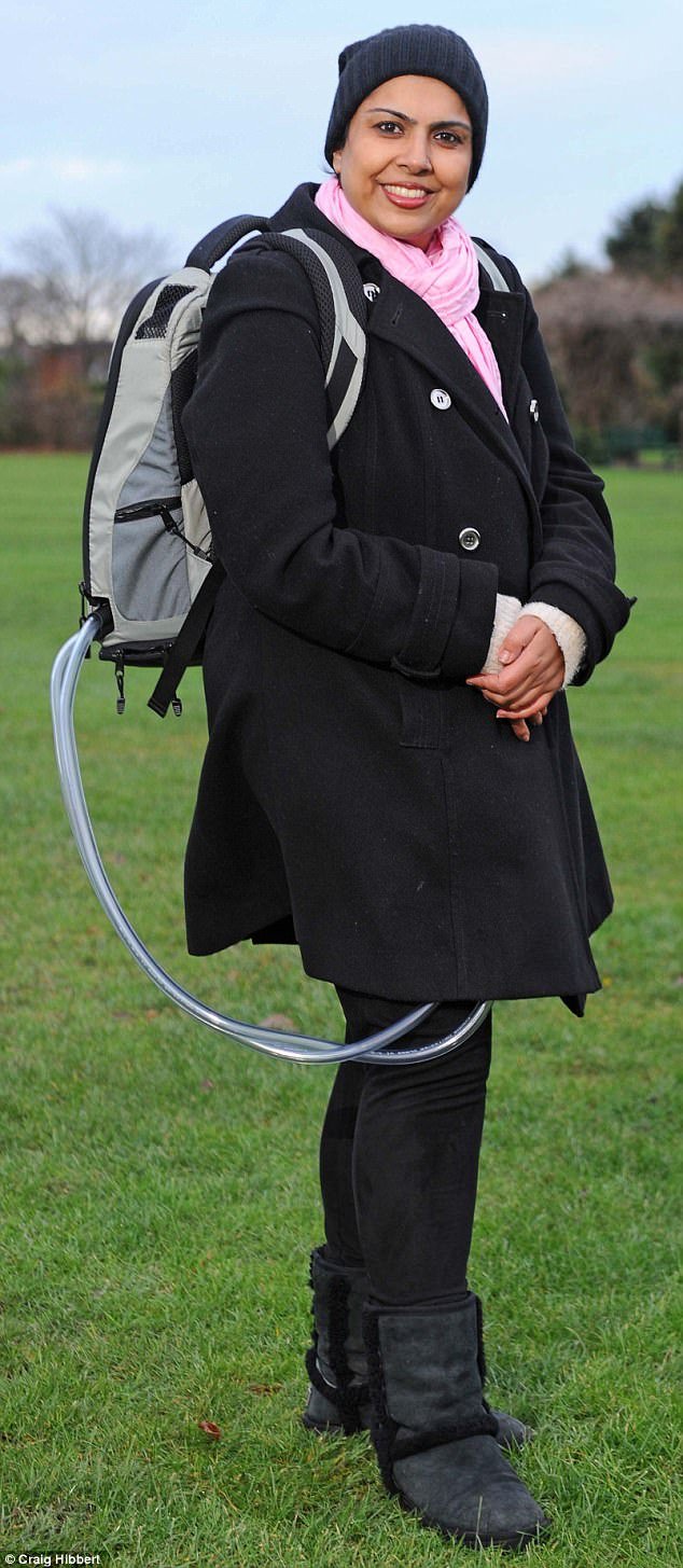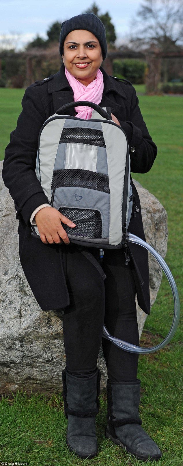Переносний пристрій у рюкзаку допомагає постачати кров органам тіла пацієнтки. Насос перекачує кров у трубки, які йдуть через живіт до серця з пластику.