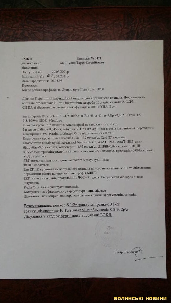 26 березня цього року Тарас проходив лікування у Волинській обласній клінічній лікарні в відділення №11 для учасників АТО. Перебуваючи в медзакладі, відчув слабкість в тілі, тиск став 150 на 50, почали турбувати біль у серці та запаморочення.