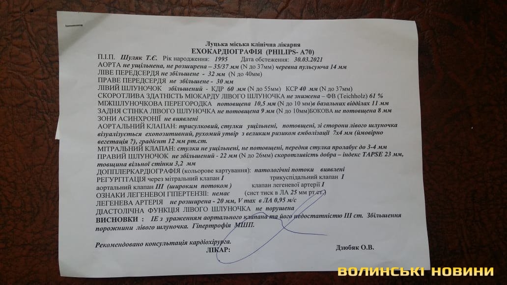 Наразі волинянину необхідна операція на серці: треба замінити один із клапанів, що уражений інфекцією, яка може поширитися на здорові тканини. Єдиним правильним рішенням є тільки заміна клапану, інших варіантів лікування, на жаль, немає.