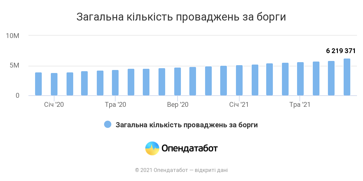 За рік загальна кількість виконавчих проваджень за борги українців також зросла на 33% й нині становить 7% від усіх проваджень про заборгованості.Загальна кількість проваджень за борги