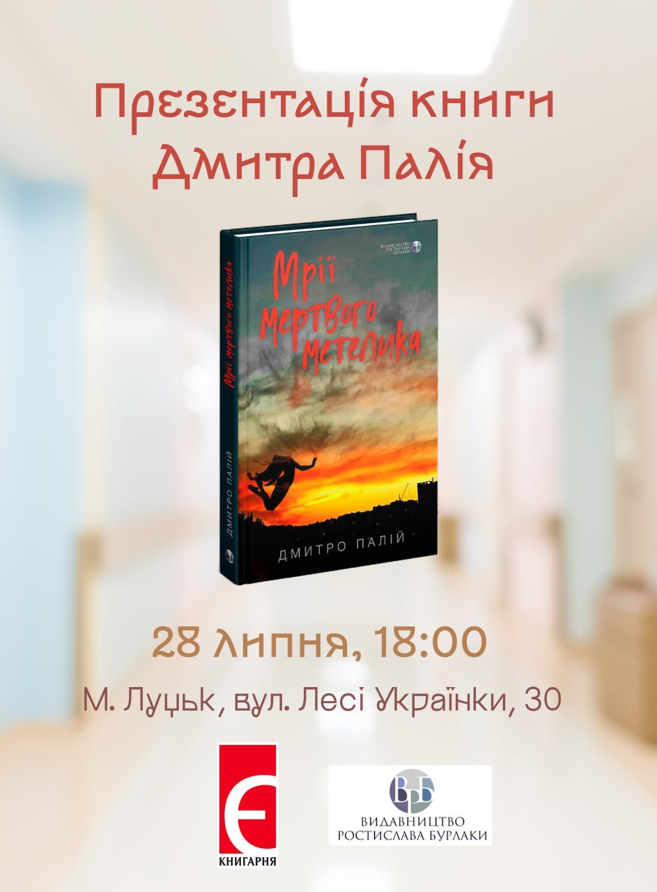 У Луцьку в Книгарні «Є» Дмитро Палій презентує новий гостросоціальний психологічний трилер «Мрії мертвого метелика». Зустріч із автором відбудеться 28 липня о 18.00 годині.
