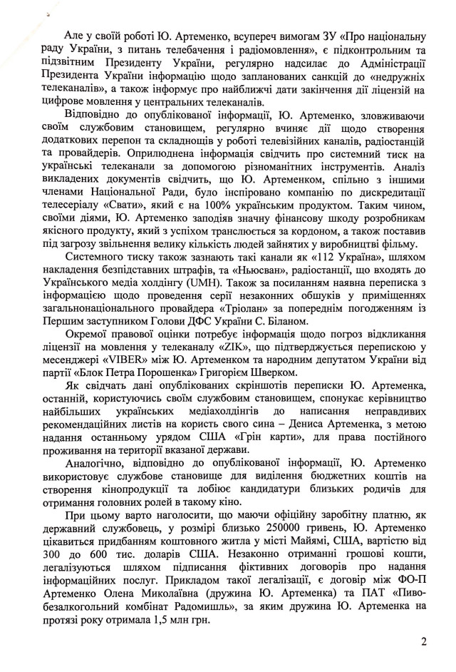 «Артеменко, зловживаючи своїм службовим становищем, регулярно вчиняє дії щодо створення додаткових перепон та складнощів у роботі телевізійних каналів, радіостанцій і провайдерів», – наголосили нардепи.
