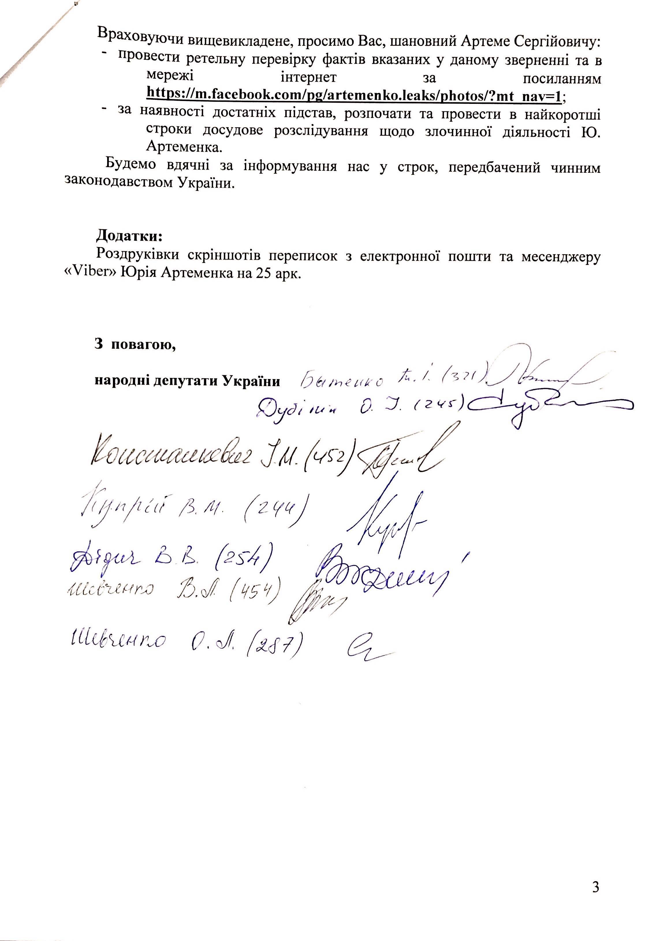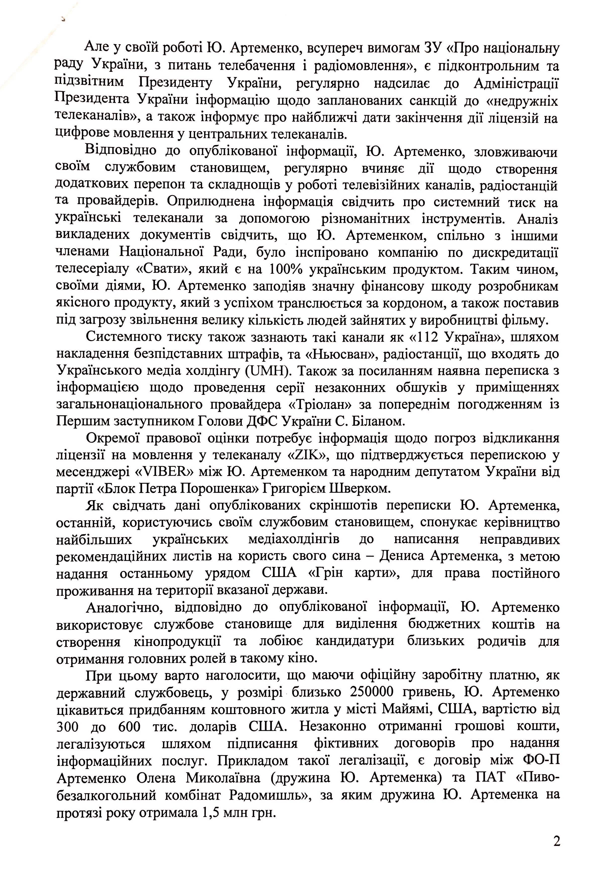 Окремої правової оцінки, на переконання парламентарів, потребує інформація щодо погроз відкликати ліцензію на мовлення у телеканалу ZIK. Це підтверджується перепискою у месенджері Viber між Юрієм Артеменком та нардепом від партії «Блок Петра Порошенка» Григорієм Шверком. «Як свідчать дані опублікованих скриншотів переписки Ю. Артеменка, останній, користуючись своїм службовим становищем, спонукає керівництво найбільших українських медіахолдингів до написання неправдивих рекомендаційних листів на користь свого сина Дениса Артеменка, з метою надання останньому урядом США грін-картки, для права постійного проживання на території вказаної держави», – йдеться у зверненні.