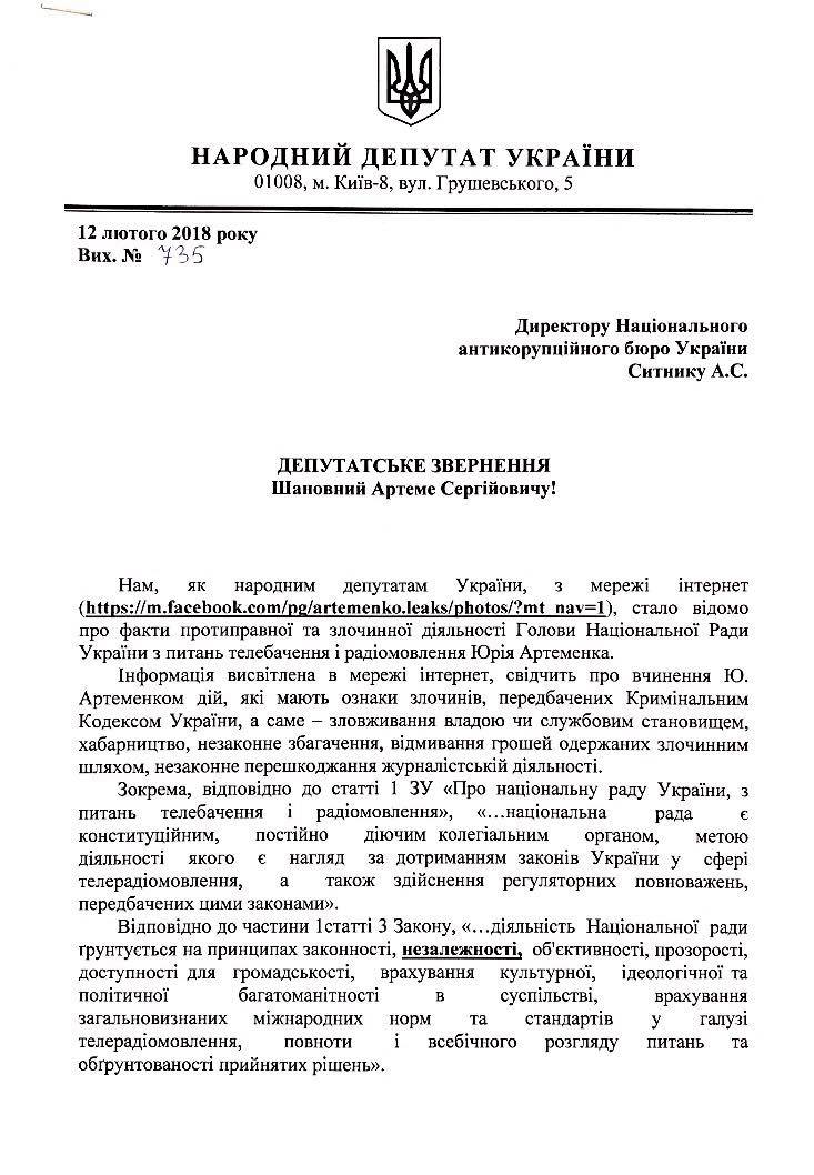 «Артеменко, зловживаючи своїм службовим становищем, регулярно вчиняє дії щодо створення додаткових перепон та складнощів у роботі телевізійних каналів, радіостанцій і провайдерів», – наголосили нардепи.