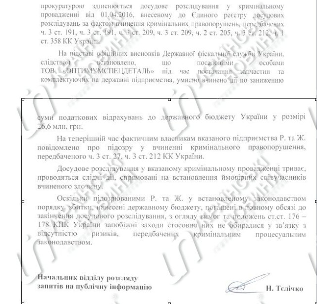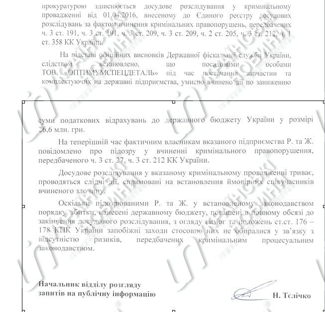 Слідство встановило, що посадові особи «Оптимумспецдеталь» під час постачання запчастин та комплектуючих на державні підприємства занизили податки на 26,6 мільйона гривень.
