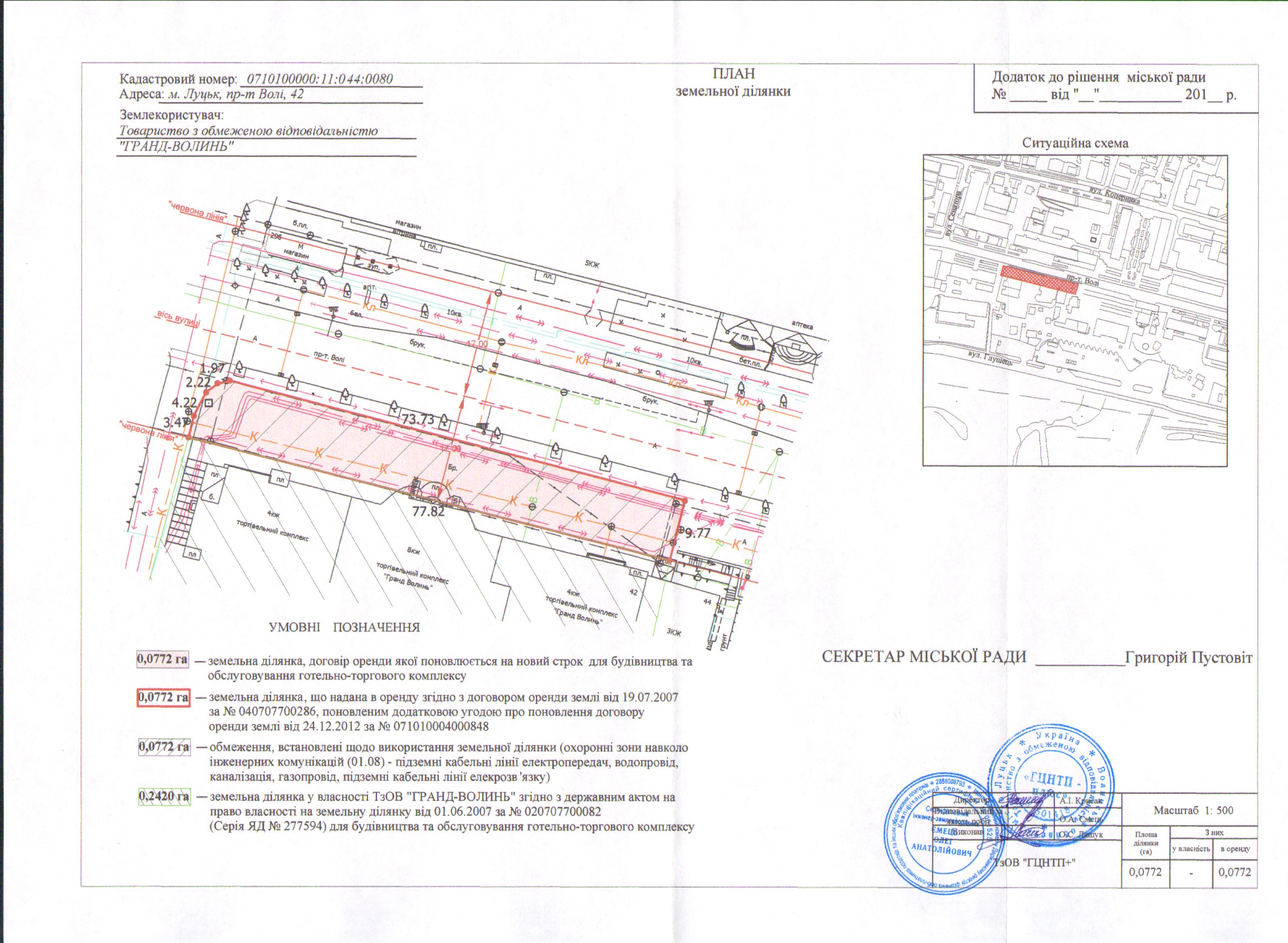 Проект рішення передбачає продовження ТзОВ «Гранд-Волинь» терміну оренди земельної ділянки на проспекті Волі, 42 строком на 10 років з дати закінчення договору оренди землі (до 24.12.2027), площею 0,0772 га для будівництва та обслуговування готельно-торгового комплексу.