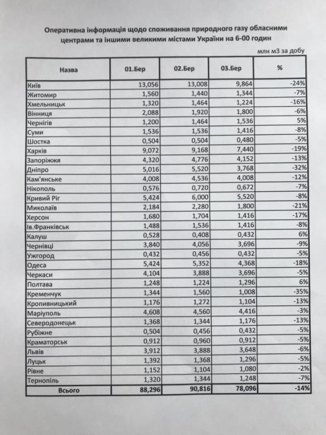 В загальній сумі по Україні 2 березня споживання газу зменшилося на 14%.