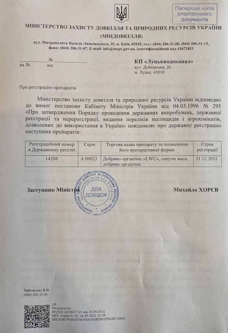 Тож 16 вересня Міністерство захисту довкілля і природних ресурсів України здійснило державну реєстрацію добрива органічного «LWC» у реєстрі пестицидів і агрохімікатів, дозволених до використання в Україні.