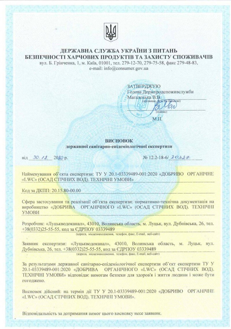 7. Отримано висновок державної санітарно-епідеміологічної експертизи на нормативно-технічну документацію на виробництво добрива органічного «LWC»;