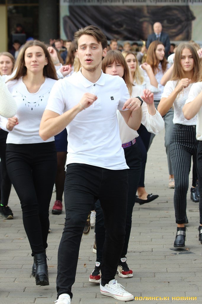 Усього танцювали понад 100 педагогів.«Цей флешмоб, а саме танець у білому, ми готували із допомогою хореографів з Палацу учнівської молоді міста Луцька. Танцювали виключно новопризначені педагоги, серед яких як вчителі-організатори, так і «предметники». Протягом двох тижнів ми збиралися на репетиції. При постановці танцю робили все для того, аби рухи виглядали енергійно та сучасно», - зазначив педагог-організатор Комунального закладу «Луцька загальноосвітня школа І-ІІІ ступенів № 15 Луцької міської ради Волинської області» Анатолій Мартовицький, який також взяв участь у заході.Натомість, начальник управління освіти Луцької міської ради Зіновія Лещенко розповіла, що цього року, відзначаючи професійне свято, освітяни вирішили дещо відійти від традиційних академічних урочистостей: