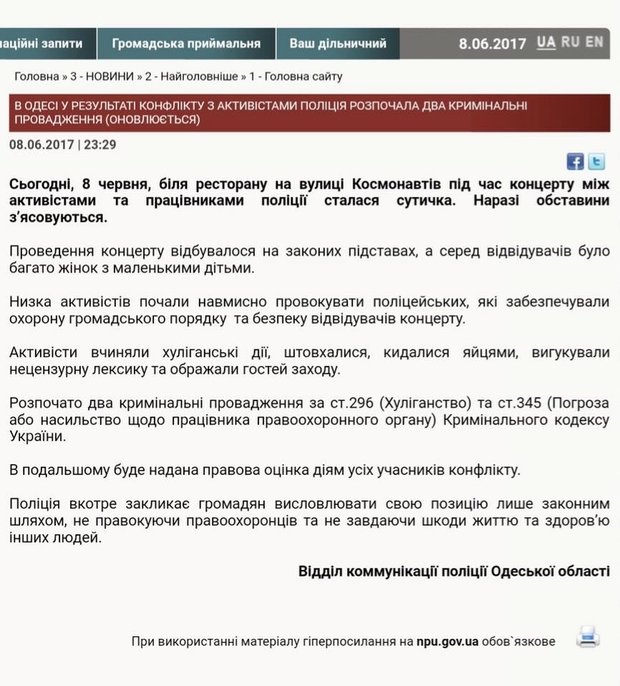 У поліції звинувачують активістів в хуліганстві і агресивних діях. За інциденту розпочато два кримінальних провадження."Укрінформу" Форостяк заявив, що арт-дирекція, яка організувала виступ Білик на відкритті ресторану "Парк Leo", дезінформувала правоохоронців, повідомивши про скасування концерту.