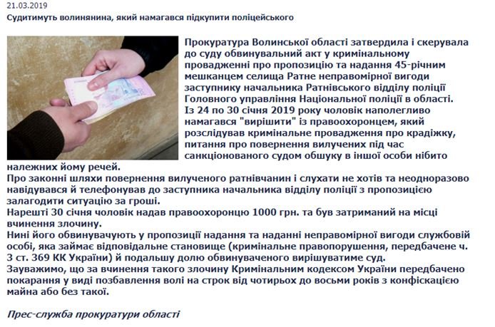 Так, чоловік переповів свою версію тих подій. Мовляв з керівництвом Ратнівського райвідділку поліції він був давно знайомий, проте 1000 гривень, яку під час затримання вилучили зі столу правоохоронці, не мала відношення до вирішення його особистих бізнесових питань. Саме таку суму правоохоронці начебто запросили за врегулювання питання з приводу повернення рейок, які були помилково вилучені в його знайомого у рамках окремого кримінального провадження.