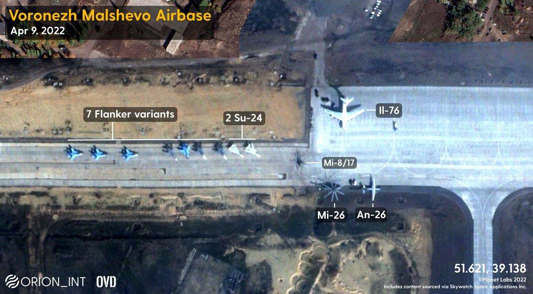 Супутникові знімки від 9 квітня зафіксували не менше 32 винищувачів Су-27, один Іл-76 та інші літаки. Усю авіацію росіяни зібрали воронезькій базі Балтімор, яку відкрили після багаторічної реконструкції у листопаді 2021 року.
