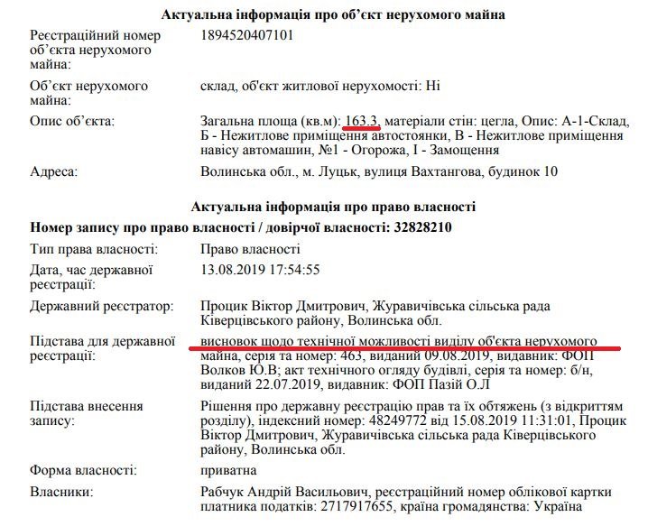 Підстава для набуття права власності на це приміщення – доволі сумнівна: висновок щодо технічної можливості виділу об’єкта нерухомого майна. Не менш дивним є і той факт, що документи оформляли підприємці з Рівного і Дніпра, а також – реєстратори з двох різних сільських рад.