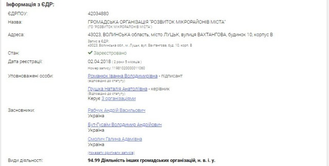 Згадана громадська організація «Розвиток Мікрорайонів Міста» зареєстрована у квітні 2018 року. Її засновники – Галина Смолич, Володимир Бут-Гусаїм та Андрій Рабчук. І ось особа останнього варта більш прискіпливої уваги.