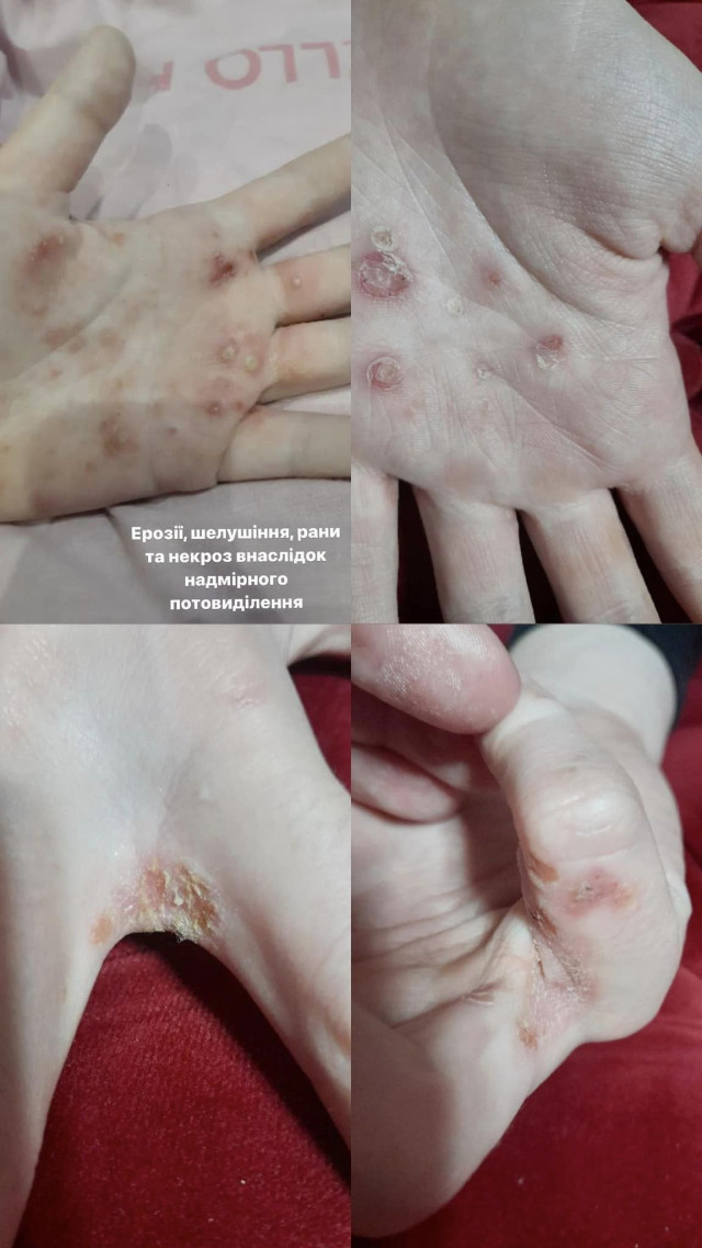 «У Олександри через надмірне потовиділення на руках і ногах були ерозії, некрози шкіри, лущення та глибокі тріщини. Такий випадок, щоб внаслідок гіпергідрозу був некроз, досить рідко трапляється. І ця пацієнтка саме така. Рідко таке буває», – розповів дитячий хірург Микола Микита.