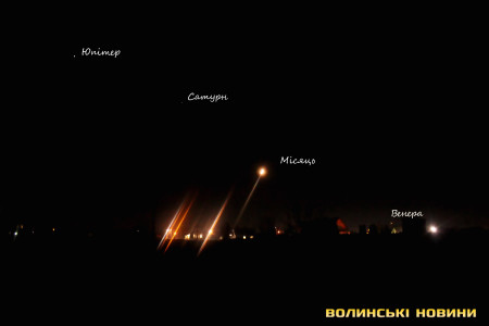 Спостерігаючи за розміщенням планет на фото, зробленому у ніч на 10 листопада, фактично на лінії горизонту можна зауважити Венеру, далі на схід розташувався Місяць, потім Сатурн і Юпітер.
