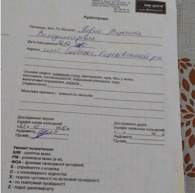 Дівчинці поставили діагноз: легка розумова відсталість, поєднана з ЗМР І-ІІ рівня, що призводить до соціальної дезадаптації. Хронічна двобічна нейросенсорна приглуховатість, глухота І ст.