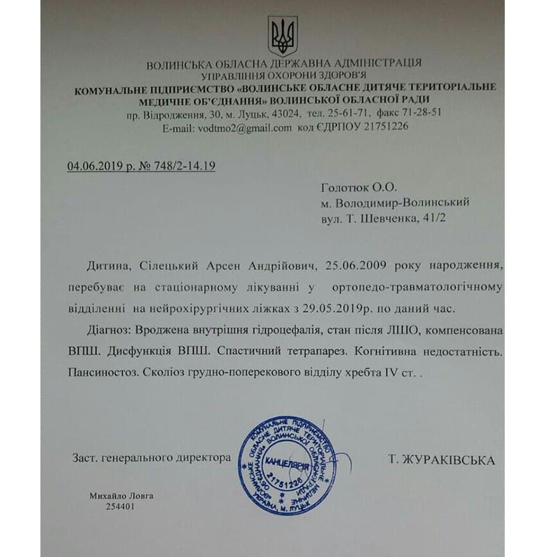 Пані Олена розповіла, що наразі виникло нове загострення хвороби, і необхідне лікування. Вже зробили оперативне втручання (ендоскопію і забрали несправного шунта, виведенний дренаж), але воно не допомогло стабілізувати стан Арсенія, тому лікарями було прийняте рішення зробити наступну операцію – заміну іншорідного тіла, яке допоможе йому жити.