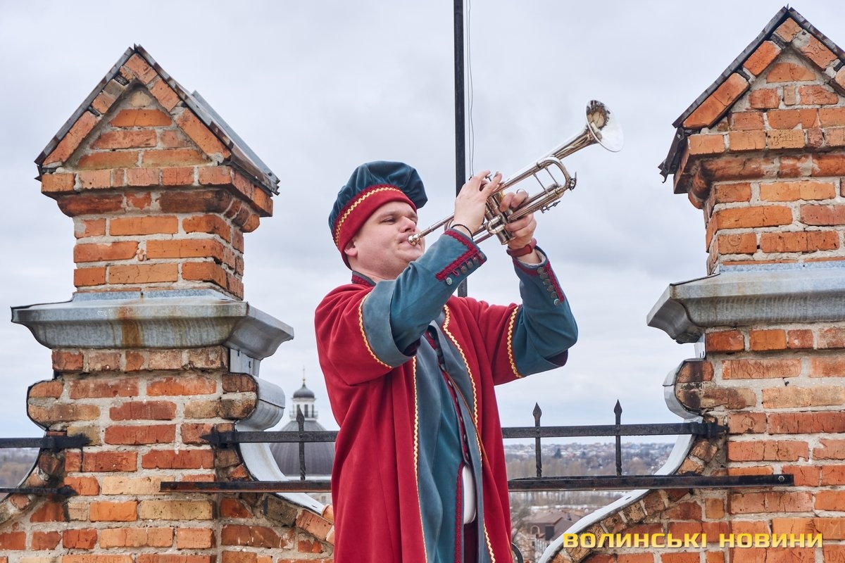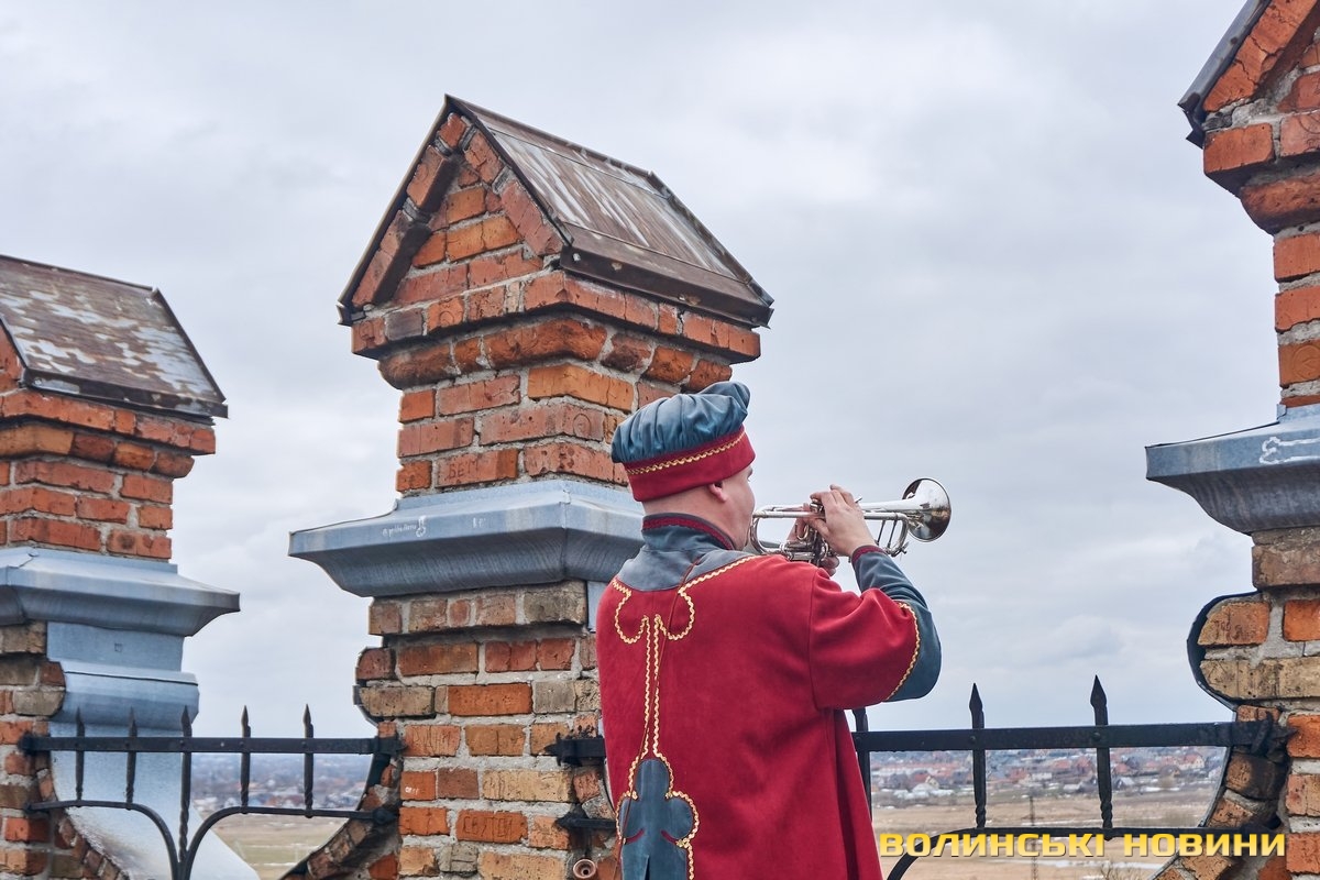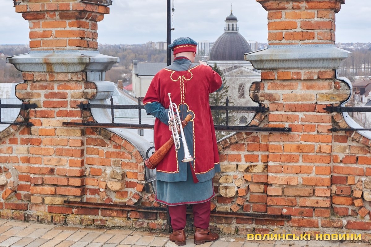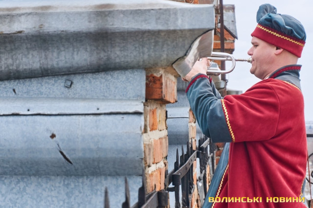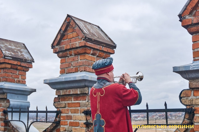 Об 11.58 ми разом із Андрієм піднімаємося на майданчик В'їзної вежі. Але перед цим доводиться подолати перешкоду, а точніше – 126. Адже саме стільки сходинок відділяють кликуна від неба. Він помітно нервує та щораз поглядає на годинник. Каже, що втоми не відчуває, лише щоразу йому перехоплює дух. «Зараз це вже ввійшло у звичку. Але все одно до відчуття того, що цієї миті є лише замок і я, годі звикнути», – зізнається Андрій Єдинак.За хвилину він підходить до огорожі, налаштовує інструмент і ось – з першими ударами дзвона до хмар летять усім відомі акорди. Кликун сурмить на чотири сторони світу, вітаючи-сповіщаючи: він на своєму посту, тож багатовікова історія Луцька триває!Олександр ДУРМАНЕНКО