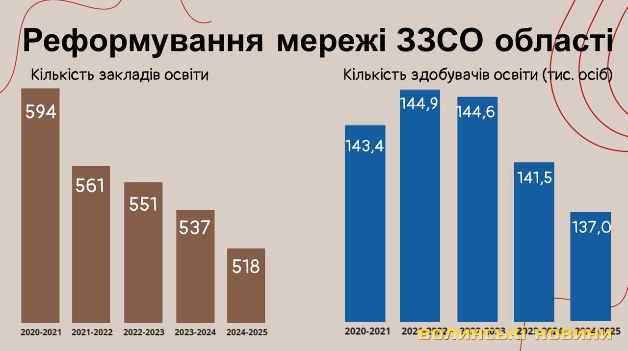 За кілька років в області було оптимізовано мережу закладів загальної середньої освіти – з 594 у 2020-2021 навчальному році до 518 у 2024-2025. Водночас за цей час кількість учнів зменшилася зі 143,4 тисячі до 137 тисяч.Наталія Матвіюк продемонструвала попередні дані про те, як зміниться кількість ліцеїв у районах області. В окремих територіальних громадах регіону загалом не заплановано створення академічних ліцеїв. Це, зокрема, громади з центрами в Рівному, Смідині, Колодяжному, Поворську, Устилузі, Литовежі.«13 територіальних громад не планують створювати академічні ліцеї. Коли вони розглянули кількість учнів і можливості довезення, можливості наявних закладів освіти, вони переконалися в тому, що недоцільним є створення академічних ліцеїв на їх території», – сказала Наталія Матвіюк.Нагадаємо, що реформа «Нова українська школа» впроваджується в Україні восьмий рік. Вона вже завершилася в початковій школі та гімназії. Нині ж триває роботи над стартом у 2027 році реформи в старшій школі.