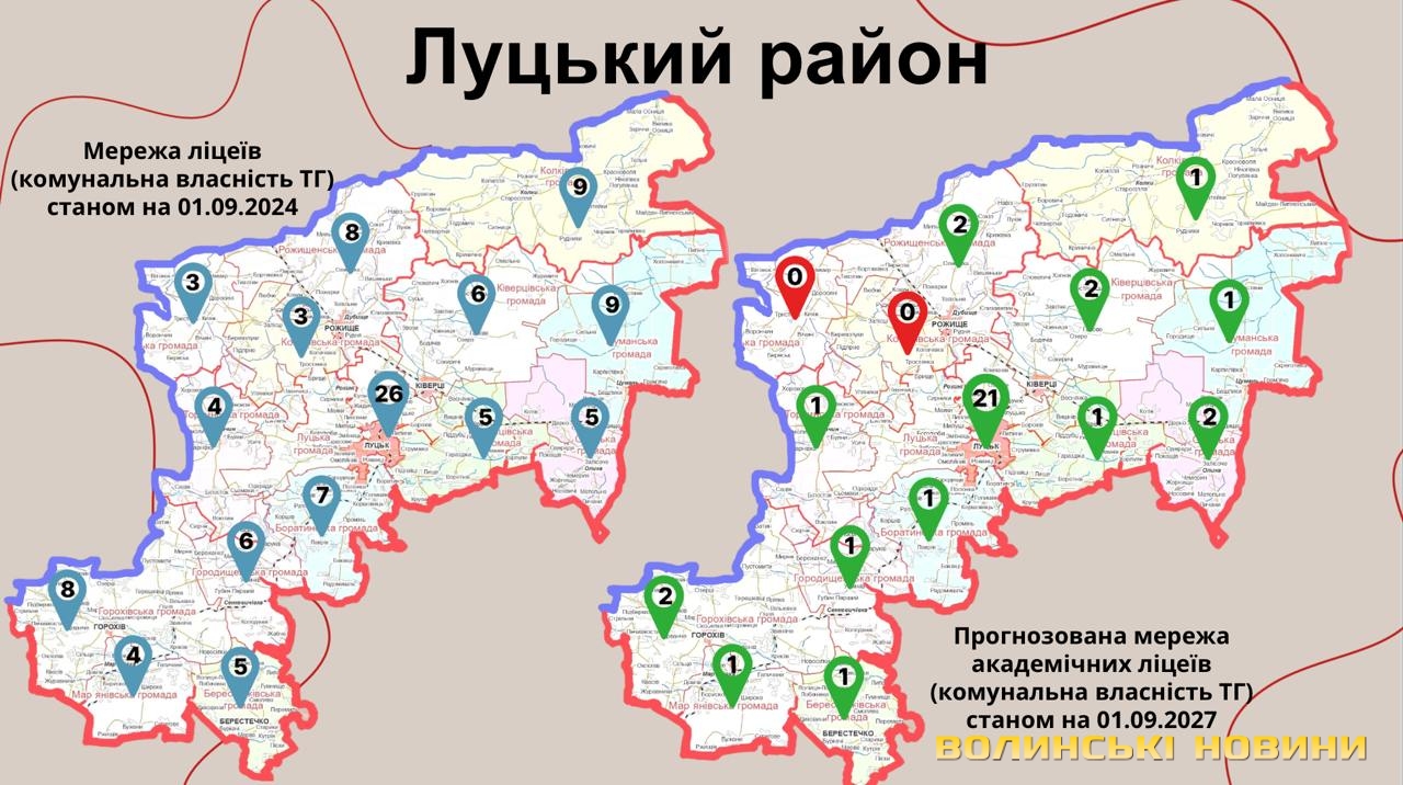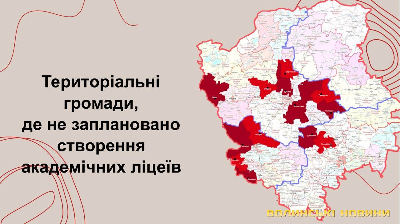 У 13 громадах Волинської області не заплановано створення академічних ліцеїв. Це, зокрема, Рівненська, Оваднівська, Устилузька, Поромівська, Литовезька, Смідинська, Дубівська, Сереховичівська, Колодяжненська, Поворська, Велицька, Доросинівська та Копачівська громади.