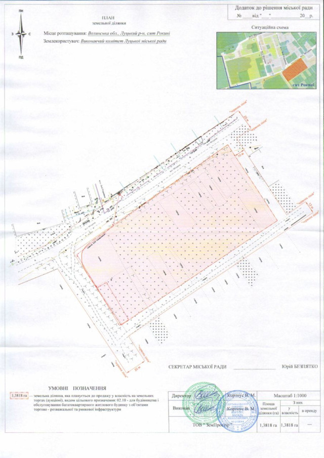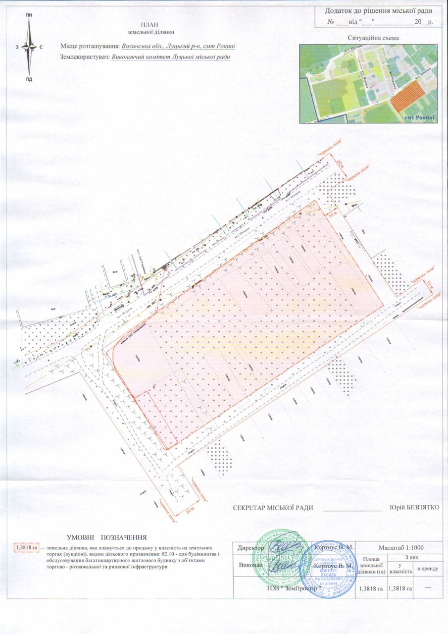 Як вказано, площа земельної ділянки – 1,3818 гектара. Вид цільового призначення – 02.10 для будівництва й обслуговування багатоквартирного житлового будинку з об’єктами торгово-розважальної та ринкової інфраструктури.