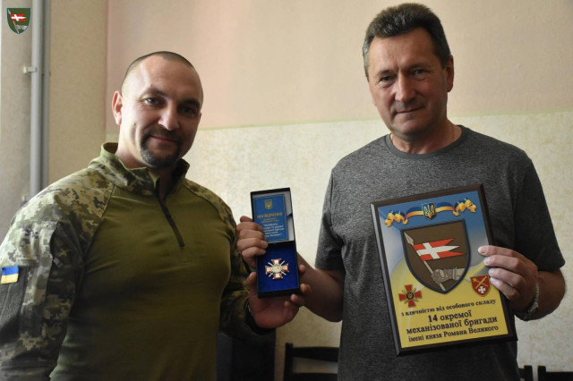 Командир 14 окремої механізованої бригади вручив Анатолію Цьосю відзнаку командира 14 ОМБр імені князя Романа Великого та бригадний мерч, що, за словами ректора, стало для нього великою честю та несподіванкою.Сам Анатолій Цьось прибув на фронт до воїнів бригади з «подарунками», серед яких, зокрема, сонячні батареї та лікарські засоби (еліксири та мазі), які виготовляють студенти та викладачі ВНУ ім. Лесі Українки, а також волонтерська допомога від друзів із Польщі та Франції.«Твердо знаємо, що співпраця між нашою Князівською бригадою та ВНУ ім. Лесі Українки буде не просто результативною, а стане початком великої дружби і єднання між військовими, які захищають Україну, та освітянами, які формують її майбутнє», – зазначають у бригаді.