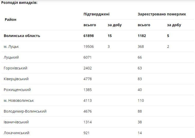 Головний державний санітарний лікар області інформує, що за останню добу на Волині зареєстровано 15 нових підтверджених випадків коронавірусної хвороби COVID-19 (з них дітей – 0, медпрацівників – 1). Одужало за добу – 118 осіб, померло – 5 осіб.