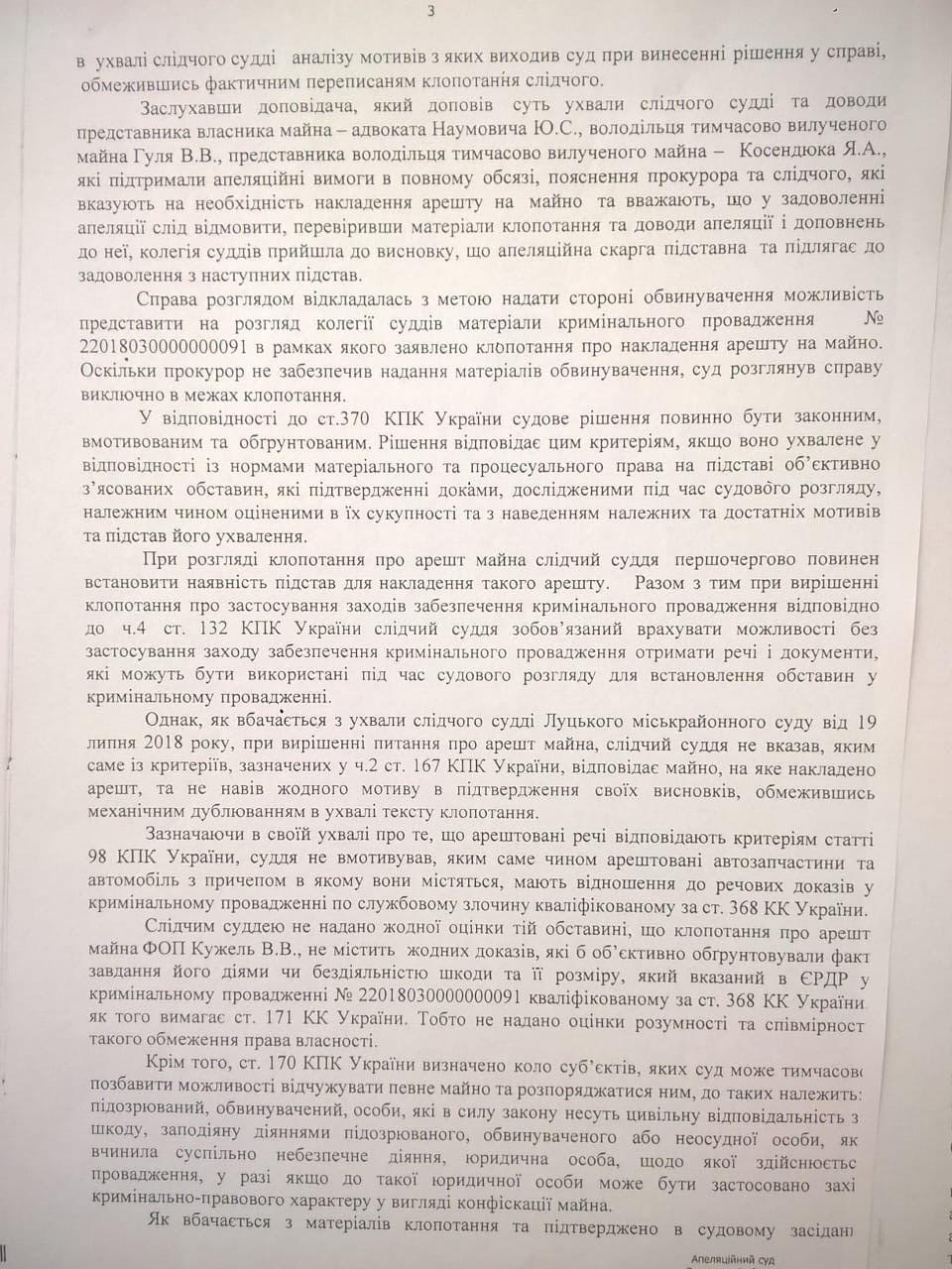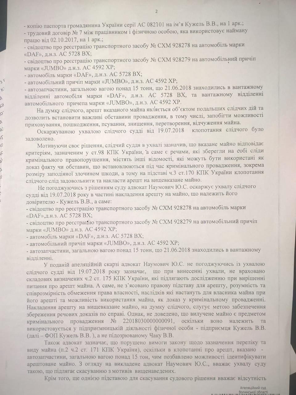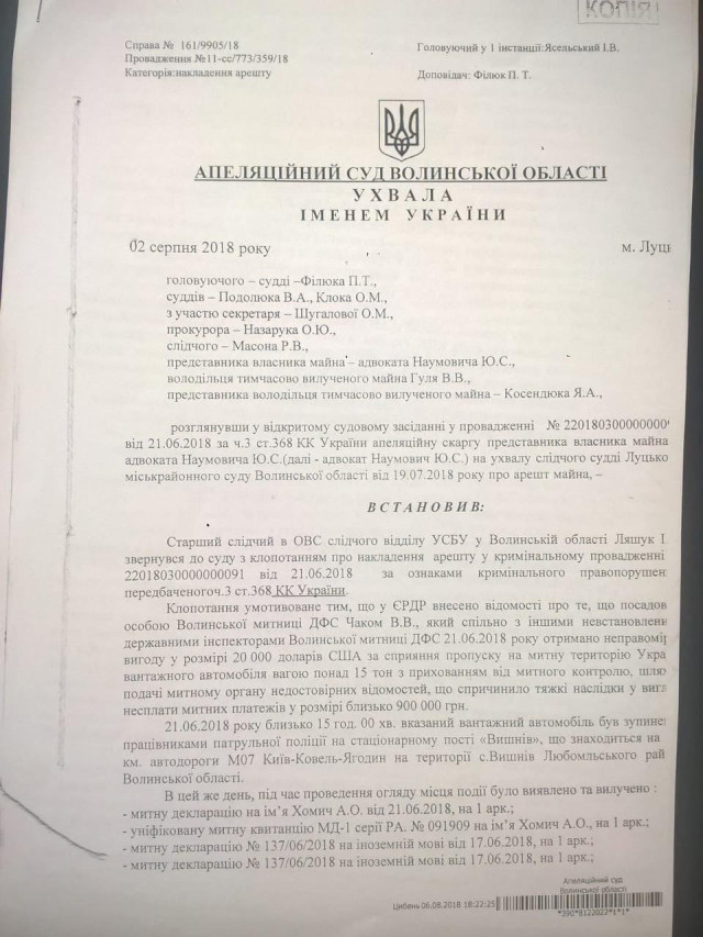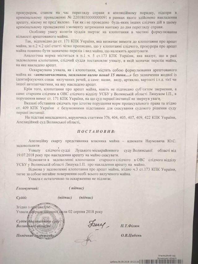 Не вдалося і арештувати контрабандні запчастини. А все тому, що голова Апеляційного суду Волинської області Петро Філюк скасував рішення Луцького міськрайонного суду про накладення арешту на вилучену партію контрабанди через те, що суд «повірив» стороні захисту, яка стверджувала, що затриманий вантаж не перетинав митний кордон України, а був завантажений до автомобіля вже після виїзду автомобіля за межі митного пункту пропуску.