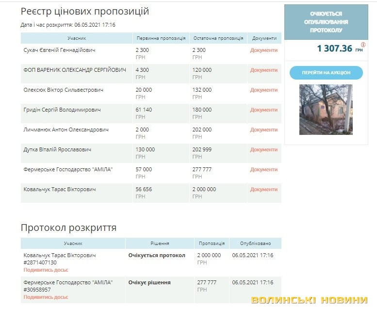 На аукціон, який відбувся 6 травня, свої пропозиції подали 8 учасників. Найбільшу суму, а це 2 мільйони гривень, запропонував Тарас Ковальчук.Компанією, яка запропонувала другу за величиною суму за ці об’єкти є ФГ «Аміла», яке виявило намір заплатити 277 777 гривень.
