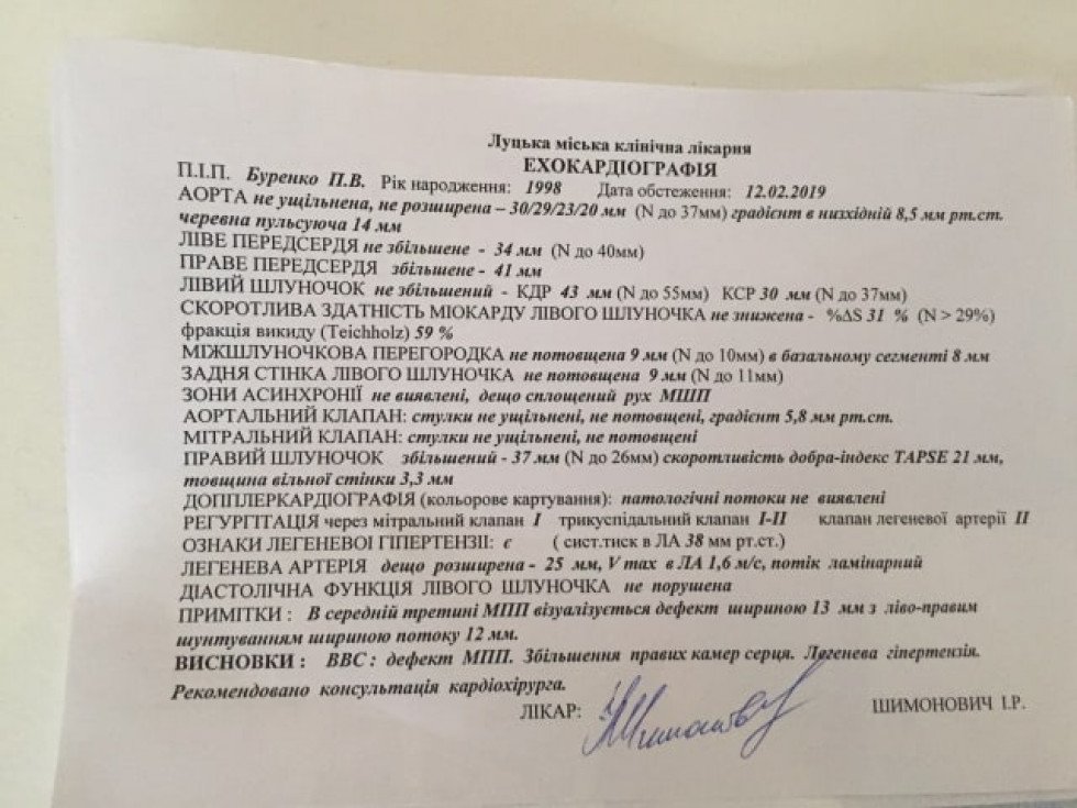 Наразі у передсердній перетинці молодого чоловіка отвір 13 мм, через це – неправильне формування легень. Лікарі ставлять діагноз «легенева гіпертензія 2 категорії». Це проявляється тим, що Петро задихається. Операція, на якій наполягають лікарі, вартує 100 тисяч гривень!