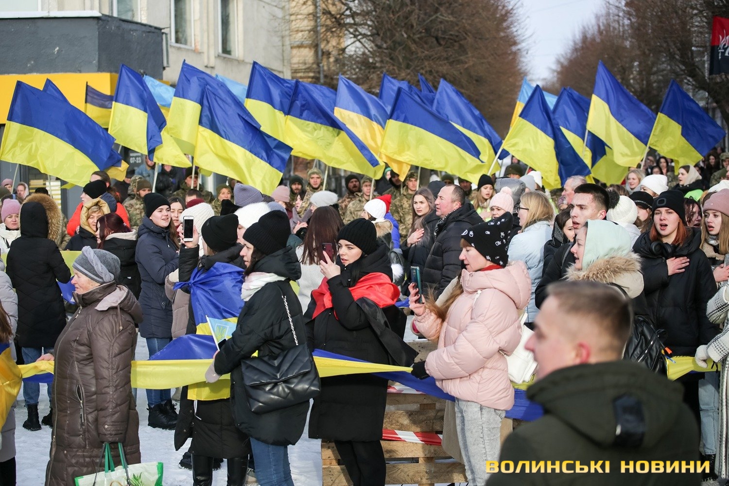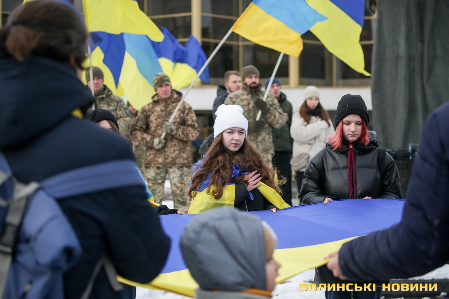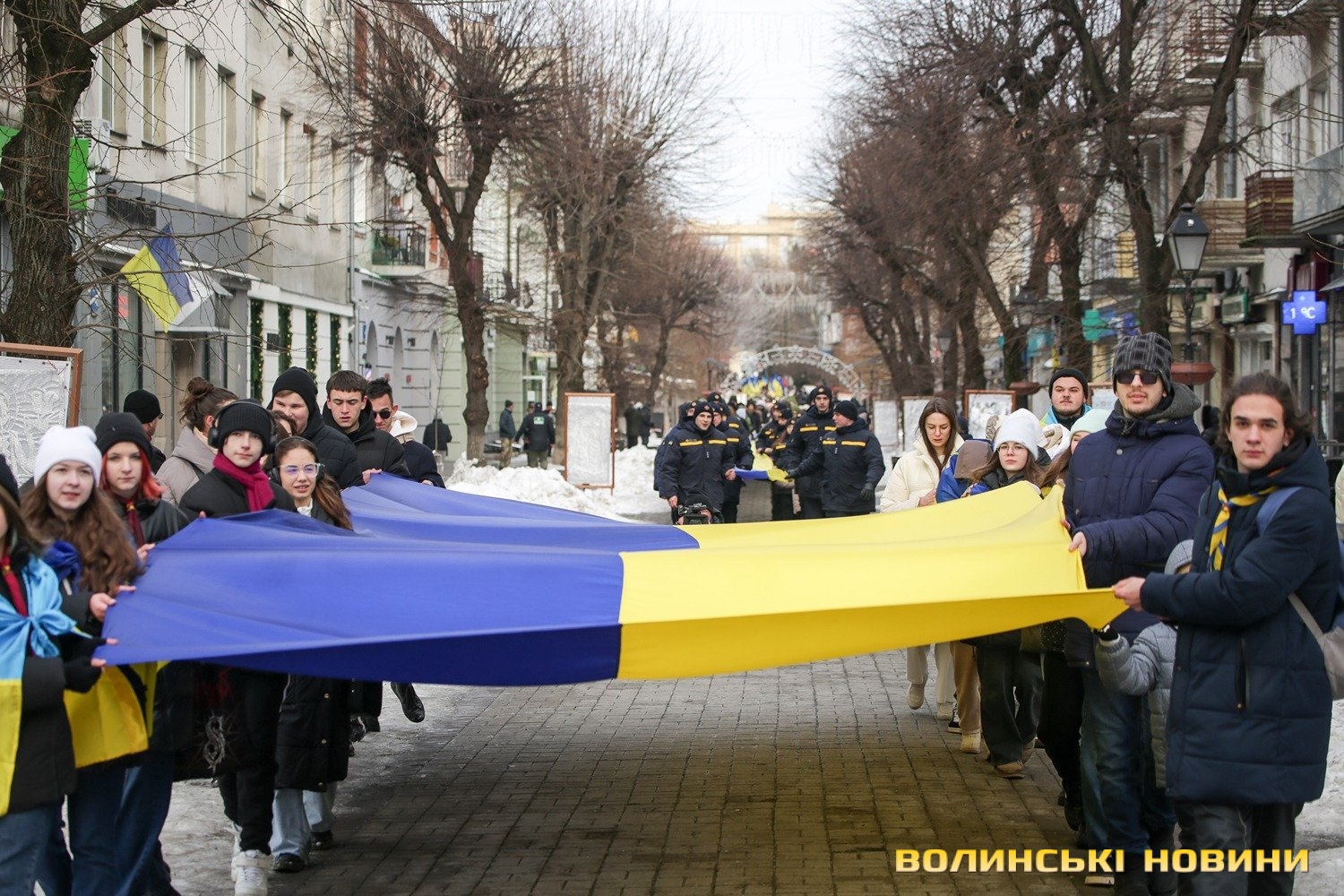 З цієї нагоди в Луцьку відбулася акція «Ланцюг єднання», під час якої учасники розгорнули двохсотметровий український прапор та пройшли патріотичною ходою від Театрального майдану до площі Злуки.