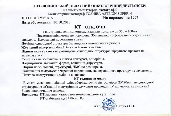 «Ми три рази були в Києві в інституті раку і інституті нейрохірургії . В інституті нейрохірургії в мене виявили пухлину в головному мозку, а біля неї багато новоутворень.Сказали, чим швидше потрібна операція. У Львові в інституті генетики дали три місяці відпочинку. Зараз потрібні кошти на комп’ютерну діагностику з контрастом на все тіло і МРТ з контрастом головного мозку і подальше лікування», – розповідає дівчина.