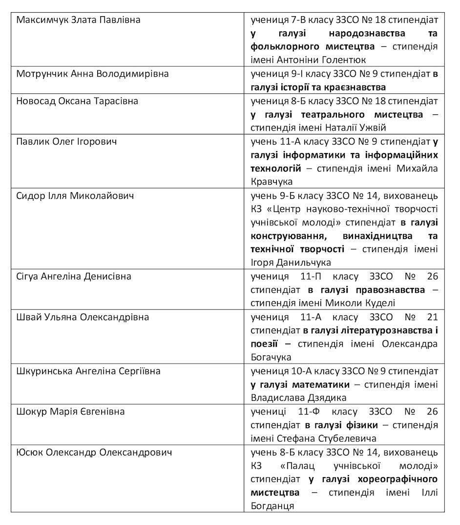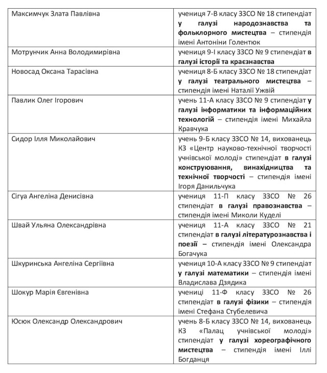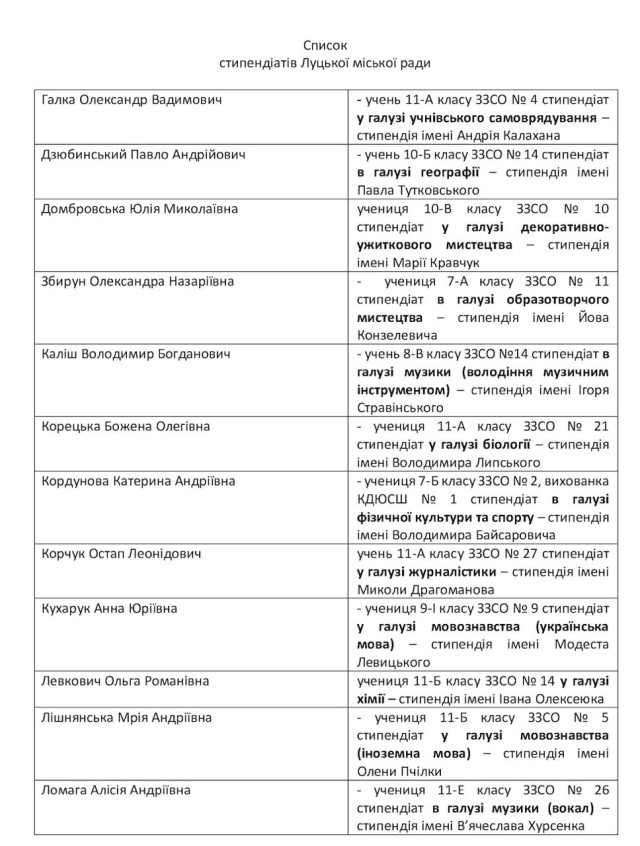 Стипендіатами Луцької міської ради стали 22 найкращі учні та вихованці закладів загальної середньої та позашкільної освіти Луцької міської територіальної громади, які мають високі досягнення у відповідних сферах навчання та спорту і беруть активну участь у громадському житті закладу освіти й громади.