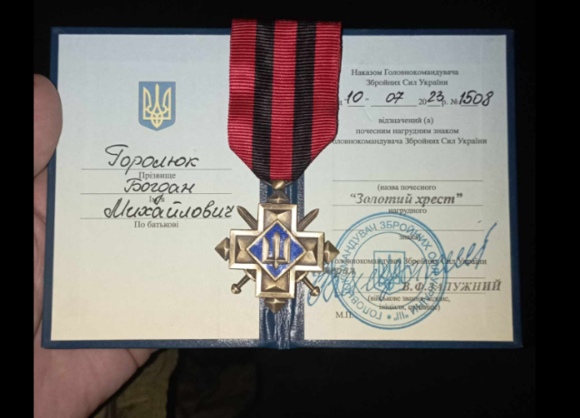 Почесний нагрудний знак «Золотий хрест» від Головнокомандувача Збройних сил України отримав 23-річний мешканець села Городині Богдан Горолюк.