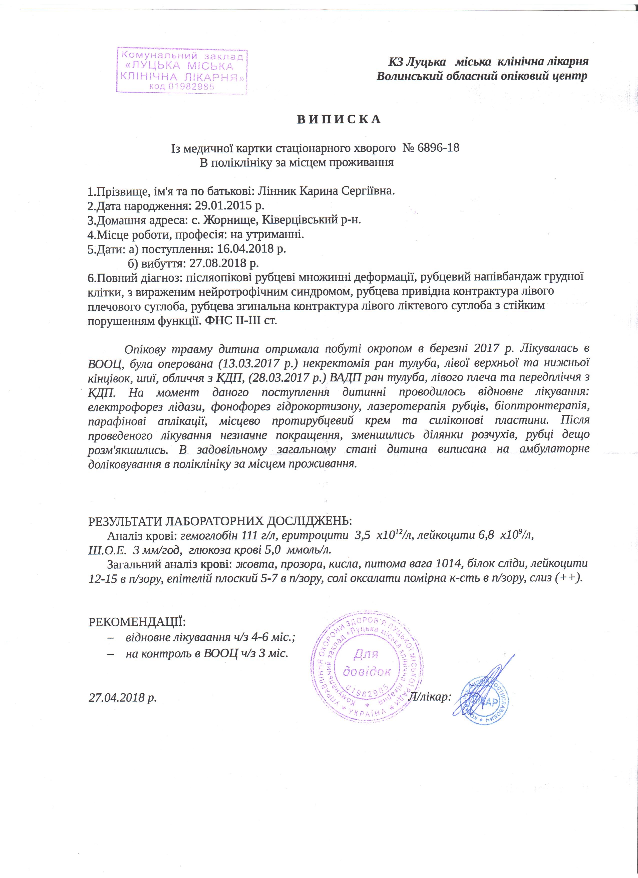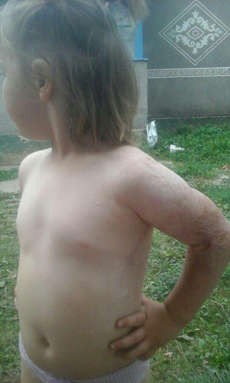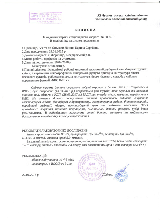 "Дитина отримала опіки у побуті. Лікувалась у ВООЦ, була прооперована (13.03.17 року) некректомія ран тулуба, лівої верхньої та нижньої кінцівокю шиї, обличчя з КАДП, (28.03.17) ВАДП ран тулуба, лівого плеча та передпліччя з КАДП", - йдеться у виписці з медичної картки дитинки.