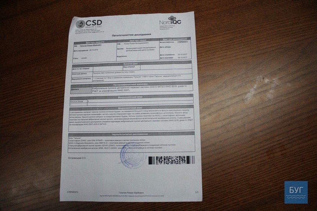 Батьки самостійно знайшли лікаря та у Києві в інституті нейрохірургії 18-го вересня 2017-го року Роман переніс першу операцію. Усю пухлину вирізати не вдалося, так як вона знаходиться біля життєво важливих органів. Далі слідували 3 курси хіміотерапії, які на жаль не допомогли. З діагнозом кістозно-солідна пухлина лівої тім’яно-потиличної ділянки головного мозгу хлопчика готували до другої операції.