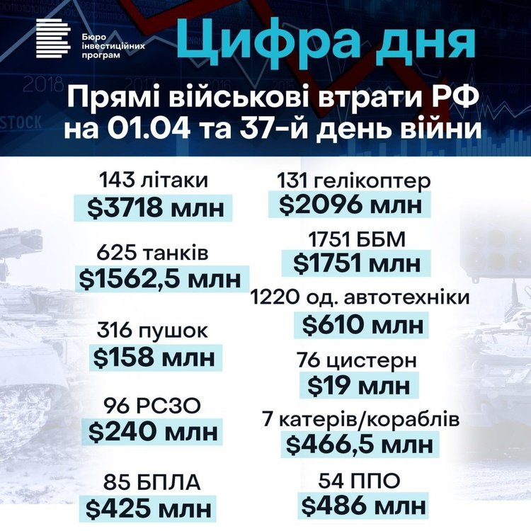 Методологія розрахунку прямих військових втрат Росії від експертів Бюро інвестиційних програм: офіційні дані від Збройних Сил України та ДСНУ про кількість знищеної техніки ворога множать на ринкові ціни цієї військової техніки. Ціни беруться з відкритих джерел, аналізуючи дані про тендерні закупівлі військової техніки, прайс-листи з відкритих джерел за останні три роки. Підрахунок проводиться з 15 березня 2022 року.Довідка