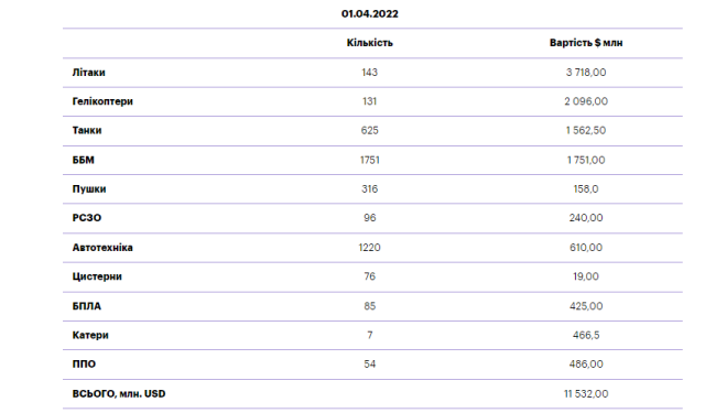 Станом на 1 квітня 2022 року військові втрати Росії склали близько $11,53 млрд від початку війни.