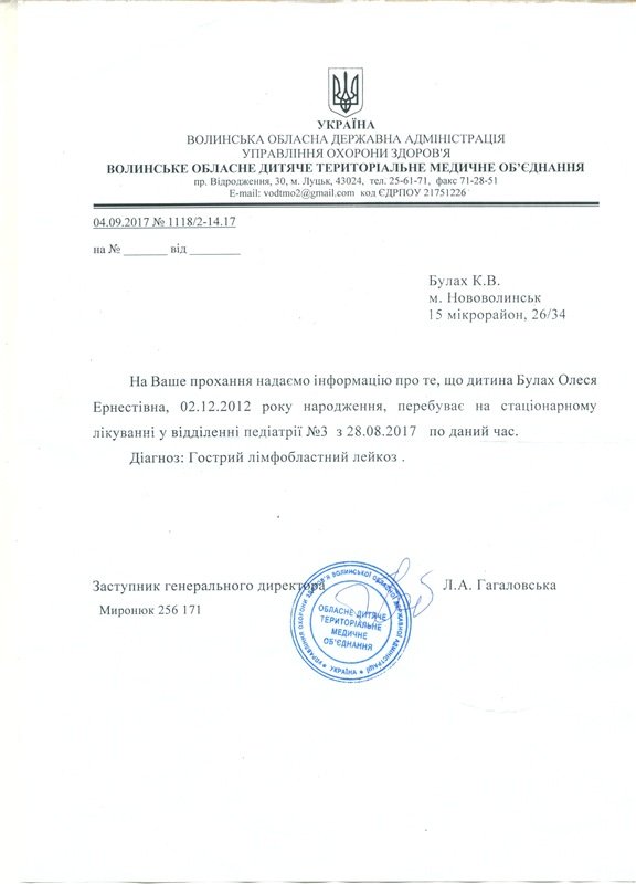 Родина мешкає у 15-му мікрорайоні. У малої - гострий лімфобластний лейкоз. Лікування довготривале – 6-10 місяців.