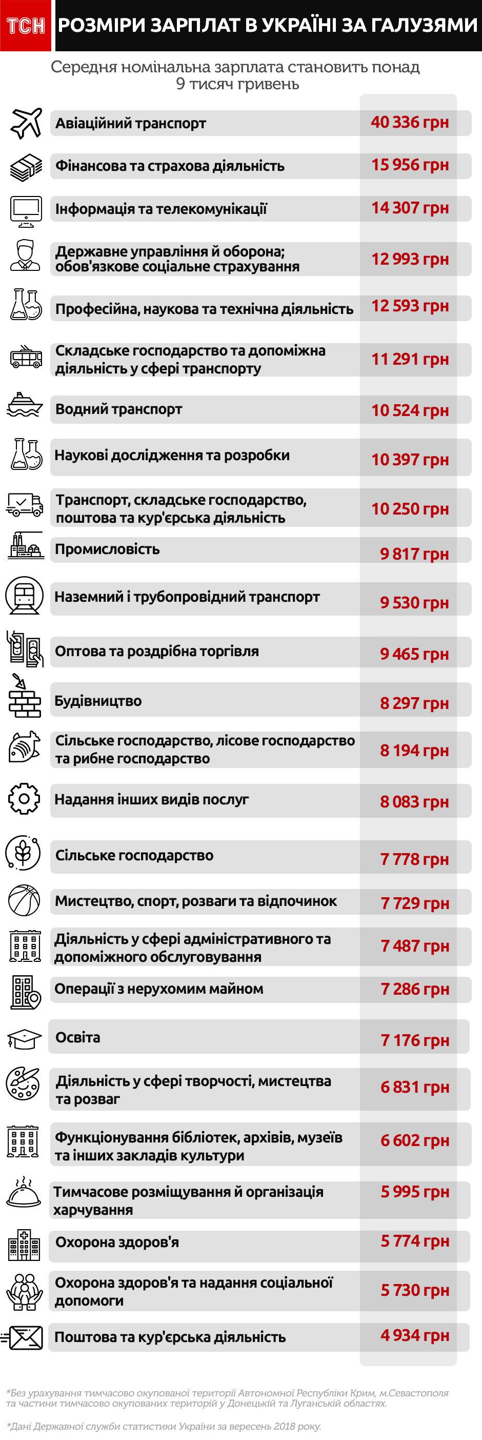 В Україні середній рівень номінальної зарплати становить 9042 грн. Традиційно найвищу платню отримують в авіаційній галузі - від середньої вона вища вчетверо і становить 40 тис.336 грн.