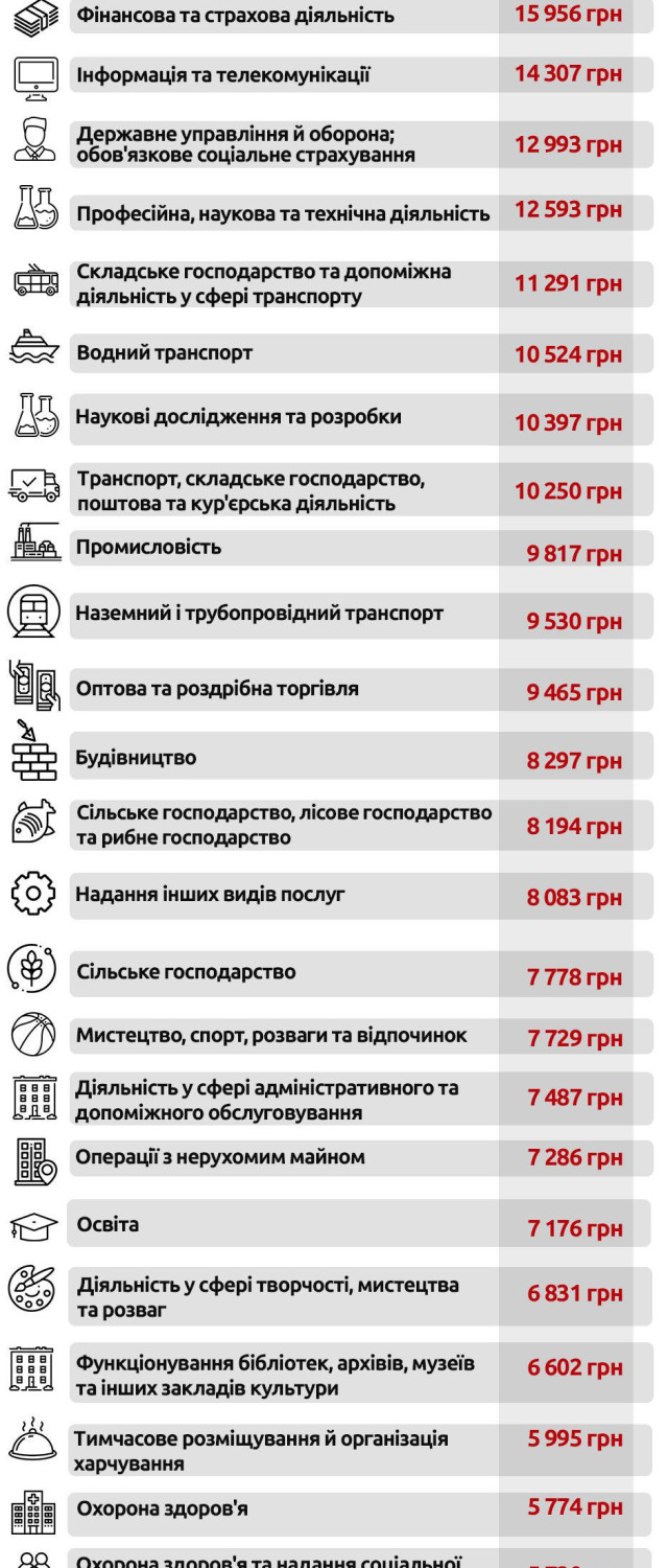 У фінансовій та страховій діяльності середні зарплати становлять 15956 грн, інформація та телекомунікації - 14307 грн, державне управління й оборона, обов'язкове соціальне страхування - 12993 грн, професійна, наукова та технічна діяльність - 12593 грн.