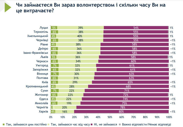 Проте 54% опитаних лучан відповіли, що не займаються волонтерством, 1% – важко відповісти або не було відповіді.